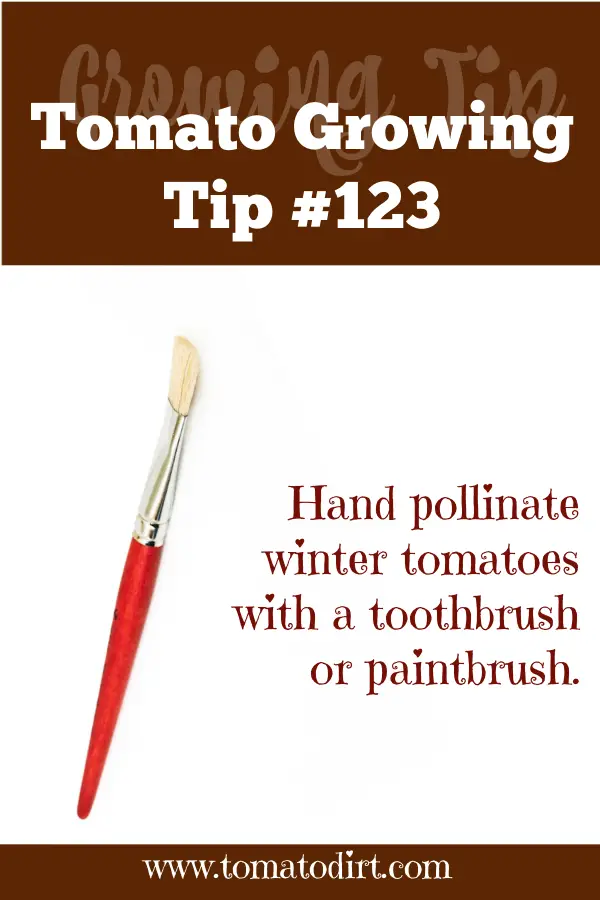 Indoor plants won’t have bees, breezes, and birds to spread pollen, so you need to help them out. When tomato plants bloom, gently shake the flowers or use a small paintbrush or electric toothbrush to transfer pollen. You can also try a small oscillating fan. “Pollinate” the blossoms daily when plants are flowering to encourage fruit production.