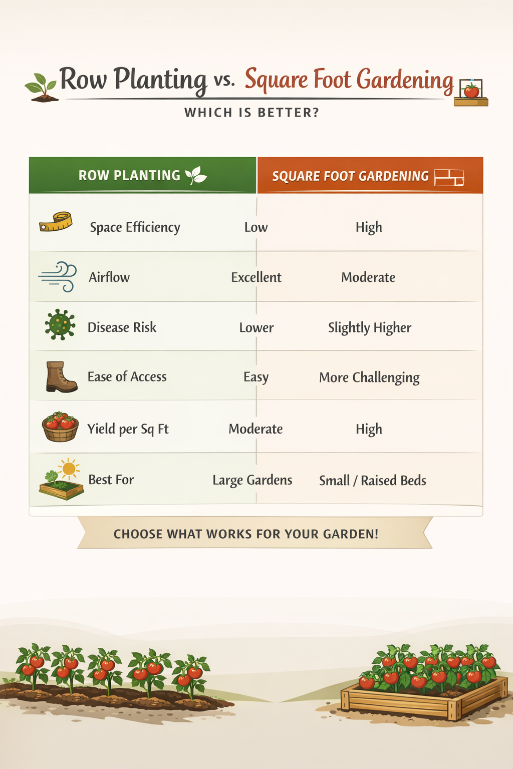 Given a choice, beginners usually find row planting easier to manage because you’ll have easier access to your plants. However, square-foot planting typically means fewer plants ... which means less time to prune, stake, water, and pick.